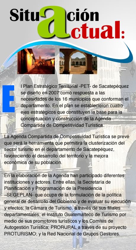 Capacitación y formación es muy importante. Adicional a las sucursales de universidades que hay (Universidad de San Carlos de Guatemala, Universidad Mariano Gálvez, Universidad Rafael Landívar) también han surgido varios colegios que se están especializando en turismo y por lo tanto son un elemento clave de apoyo al desarrollo turístico.